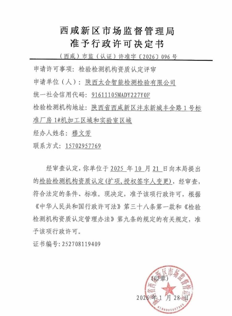 此次扩项不仅是检测能力的延伸,更是公司积极响应市场需求、不断完善服务体系的重要举措。从金属材料到建筑材料,太合检测正逐步构建起跨领域、多维度的检测服务网络,致力为客户提供科学、公正、准确、高效的检测解决方案。未来,陕西太合智能检测检验有限公司将继续秉承专业精神,不断提升技术能力与服务品质,助力行业质量提升,为客户创造更大价值!      欢迎广大客户进行咨询及实验室考察,本公司严格按照法律、法规、管理体系文件的要求进行工作。