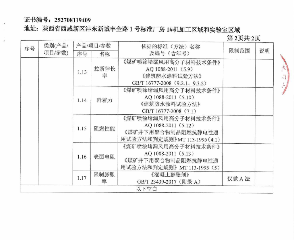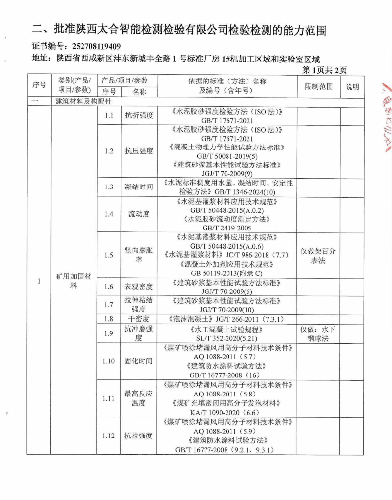 2026年1月28日,陕西太合智能检测检验有限公司顺利取得“建筑材料及构配件”领域的CMA扩项及新增授权签字人行政许可,标志着公司在多元化检测服务能力上迈出坚实一步,业务范围得到进一步拓展。本次扩项共批准矿用加固材料类17项能力参数,新增该领域授权签字人2名。可为煤矿井下、地铁隧道、水文地质灾害治理等场景的常用水泥胶砂、混凝土、建筑砂浆、水泥基灌浆、煤矿喷涂高分子等材料进行检验检测。